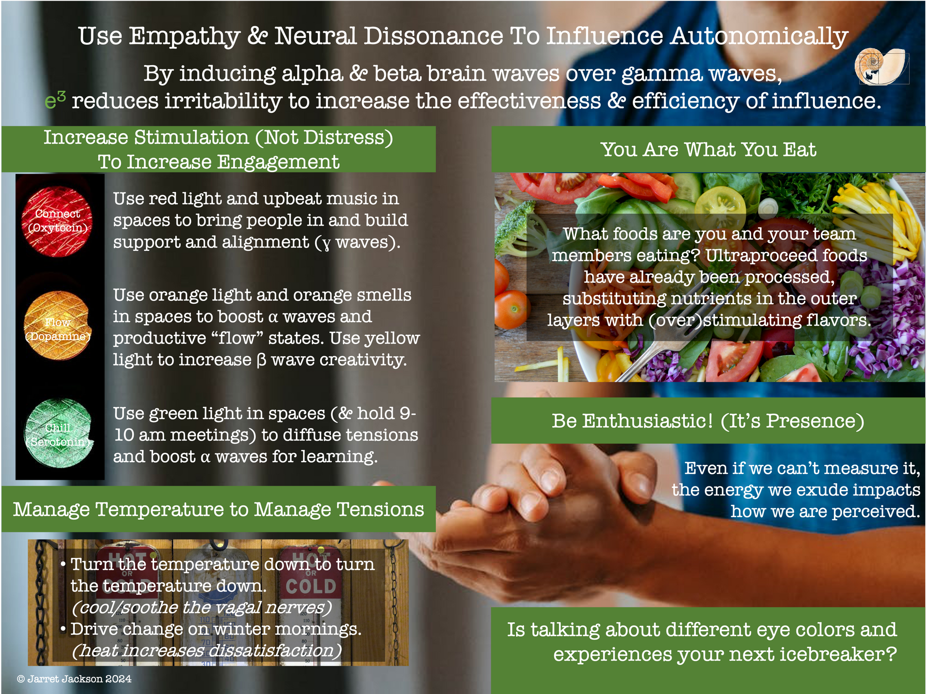 Empathy and beta waves (found in yellow light) increase engagement to drive change while minimizing distress. Resolving neural dissonance is faster and more effective than inducing cognitive dissonance and creating distress to increase performance.