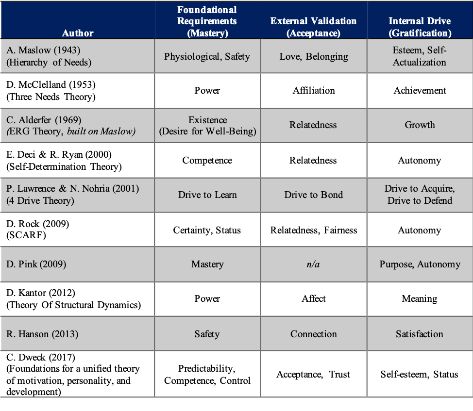 Alderfer’s ERG theory combines the six components of Maslow’s hierarchy, so the same comparison I used above applies. Existence is where our physiological needs and our need for safety are met. In the workplace, this would be mastery, or at least competence. Relatedness is love and belonging, or what I call acceptance. Growth requires self-esteem and is what we seek on our way toward self-actualization. The pursuit of both I call gratification. Like McClelland, Alderfer defines growth as driven by internal esteem, not external validation, which is why it is about gratification and not limited to the professional growth encompassed in mastery.