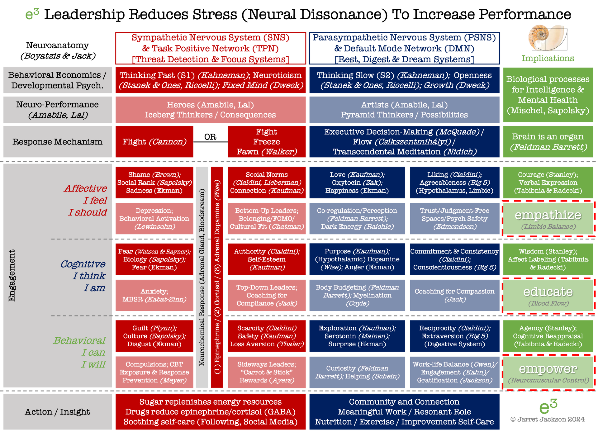 How? Neural dissonance from unexpected signals causes distress, increasing the SNS response. Leaders can engage the PSNS instead by empathizing, educating, and empowering team members to become more creative and strategic thinkers, engaged and helpful team members, and driven and accountable performers.